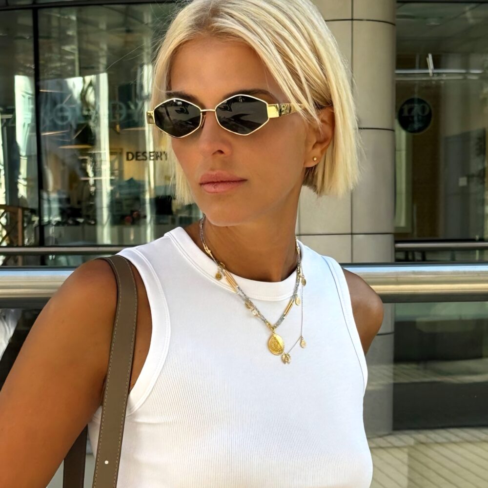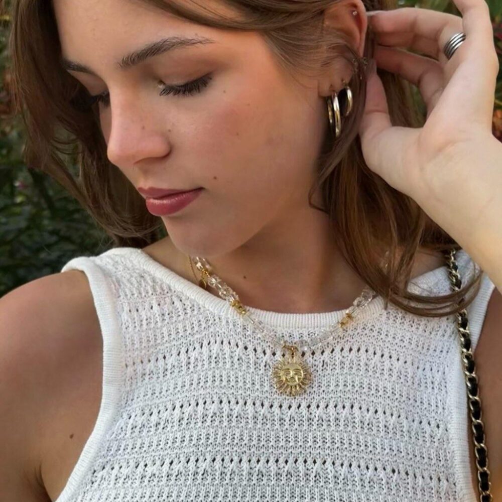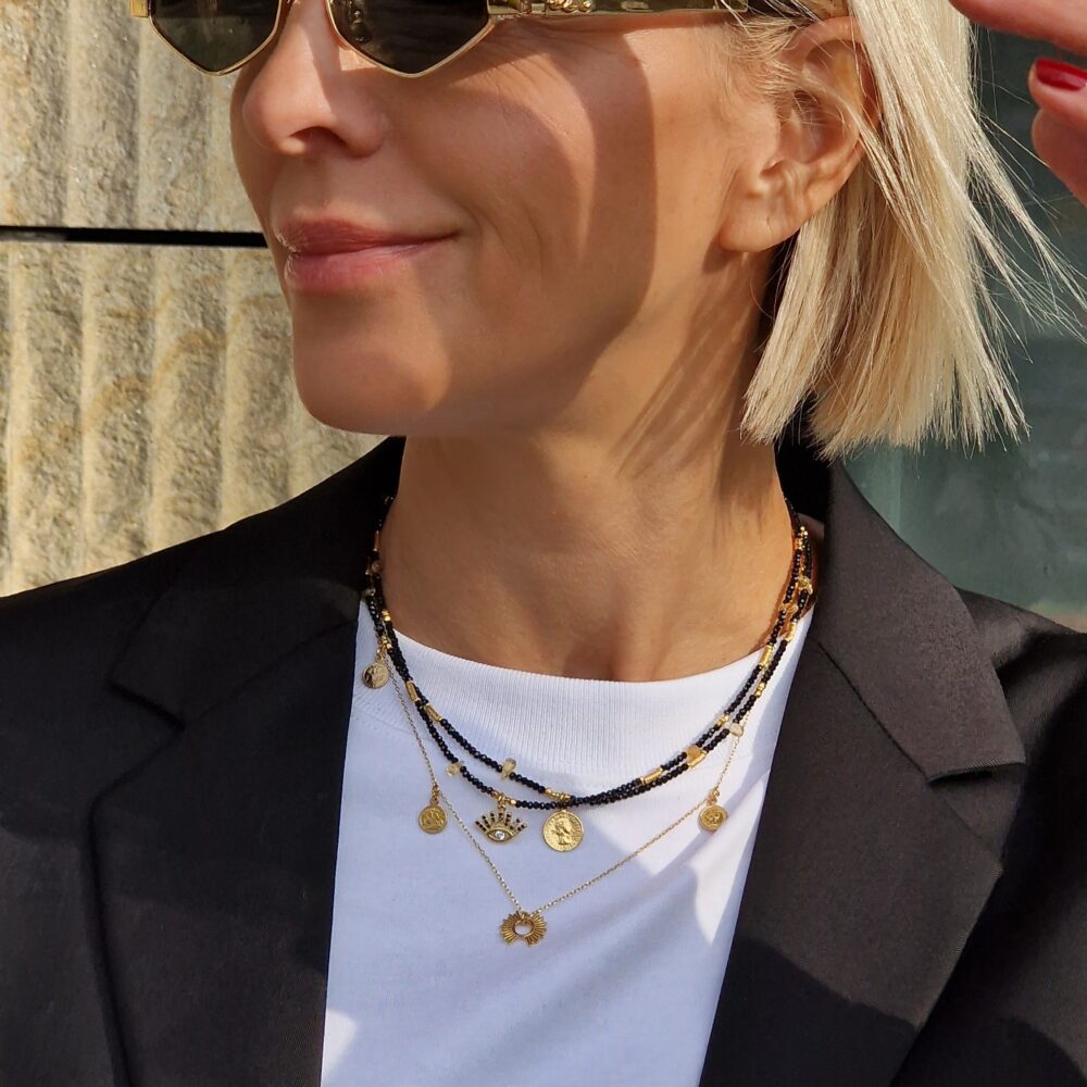 - pozłacane łańcuszki – są delikatne, bardzo kobiece i pięknie podkreślają dekolt. Możesz zakładać je zarówno do eleganckich sukienek, jak i klasycznych bluzek koszulowych czy casualowych topów. Pięknie uzupełnią niemal każdą stylizację, przykuwając uwagę subtelnym czarem zawieszek, pereł i innych ozdób,