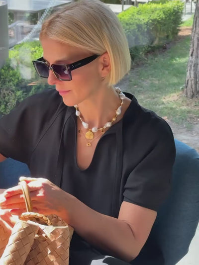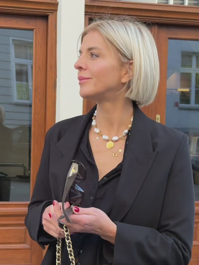 A necklace of unique, high-quality gray baroque pearls, handcrafted from 24k gold-plated 925 silver, additionally protected by an anti-tarnish layer to protect against abrasion. The pendant, shaped like a large Aztec coin (22 mm diameter), is crafted from the highest-grade silver and plated with 2 microns of pure 24k gold. The necklace is 42 cm long with an additional 7 cm adjustable chain. The gold plating, performed in collaboration with a renowned workshop in Warsaw, ensures exceptional durability and long-lasting shine. It is an ideal choice for women who value unique, handcrafted jewelry made from natural baroque pearls.