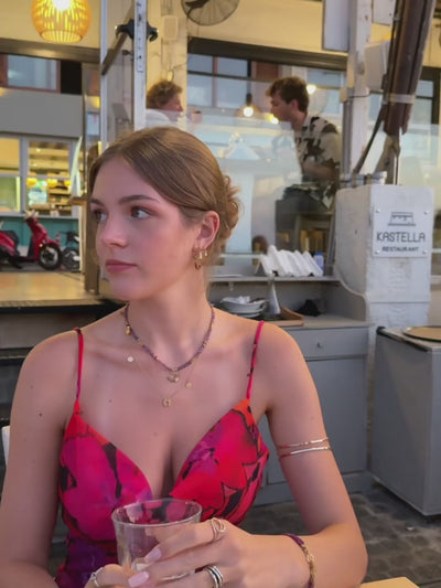 Biżuteria wykonywana jest ze srebra próby 925, pokrytego grubą warstwą złota o grubości 1–2 mikronów. To znacznie więcej niż w przypadku wielu marek, które stosują bardzo cienkie powłoki. Dzięki temu złocenie jest trwalsze, odporne na codzienne użytkowanie i długo zachowuje swój kolor.