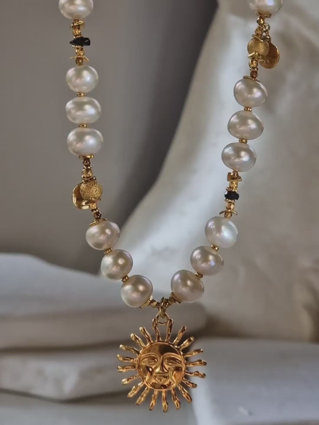 Naszyjnik ręcznie wykonany z dużych, naturalnych białych pereł w kształcie oponki o niezwykłym połysku, połączonych z czarnym turmalinem, z dużą zawieszką w kształcie Słońca oraz elementów srebra próby 925, które pozłocone jest grubą warstwą czystego, 24k złota.