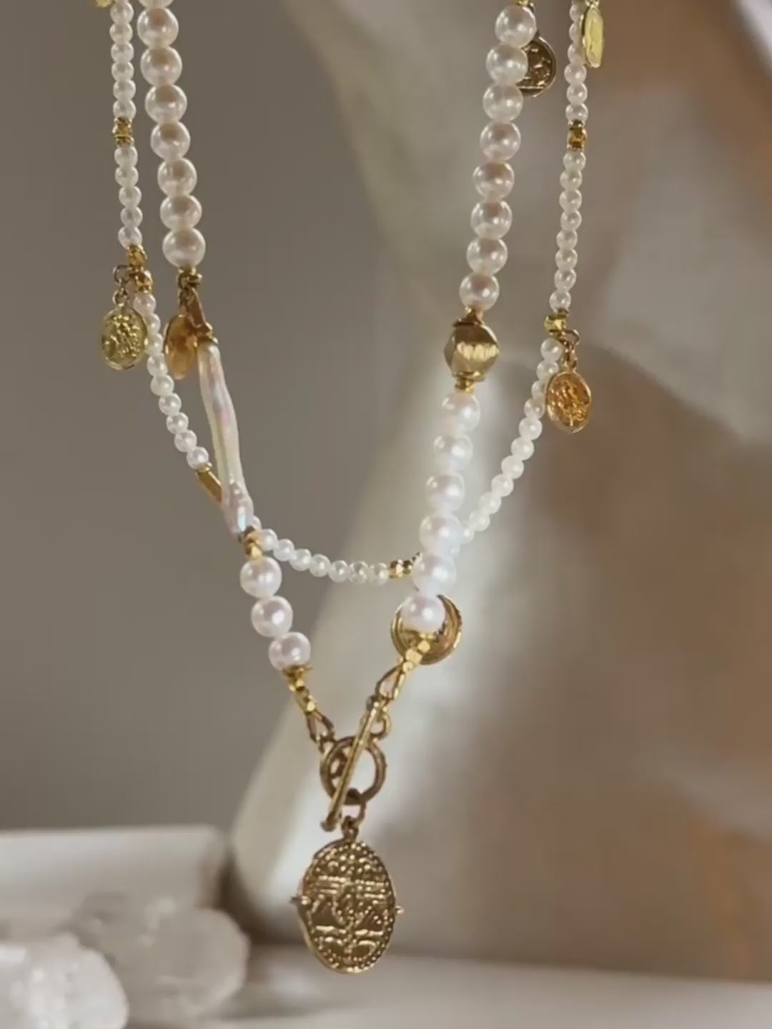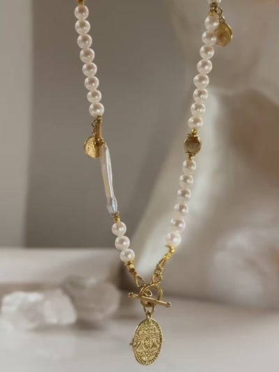 Naszyjnik ręcznie wykonany z małych, naturalnych białych pereł doskonałej jakości, które zestawiłam z dwoma wyjątkowymi, podłużnymi perłami. Całość zapinana jest z przodu na ozdobne zapięcie z patyczkiem. Wszystkie elementy wykonane są ze srebra najwyższej próby (925), następnie pozłocone 24k złotem.