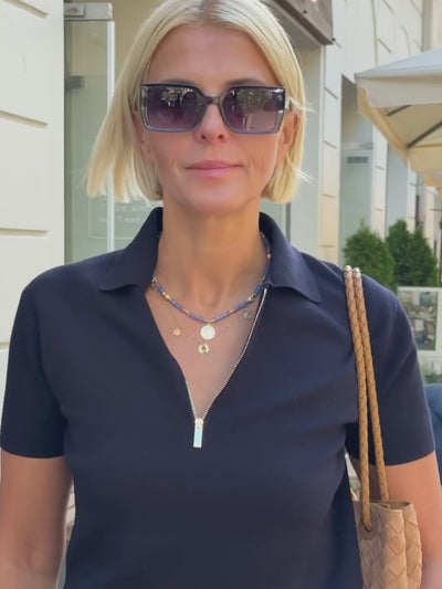 Wykonałam ten naszyjnik ręcznie, bazując na surowcach najwyższej klasy. Wykorzystałam absolutnie wyjątkowe tanzanity, które wyróżniają się doskonałą przejrzystością oraz piękną, nasyconą barwą. Całość dopełnia ozdobna zawieszka w formie monety.