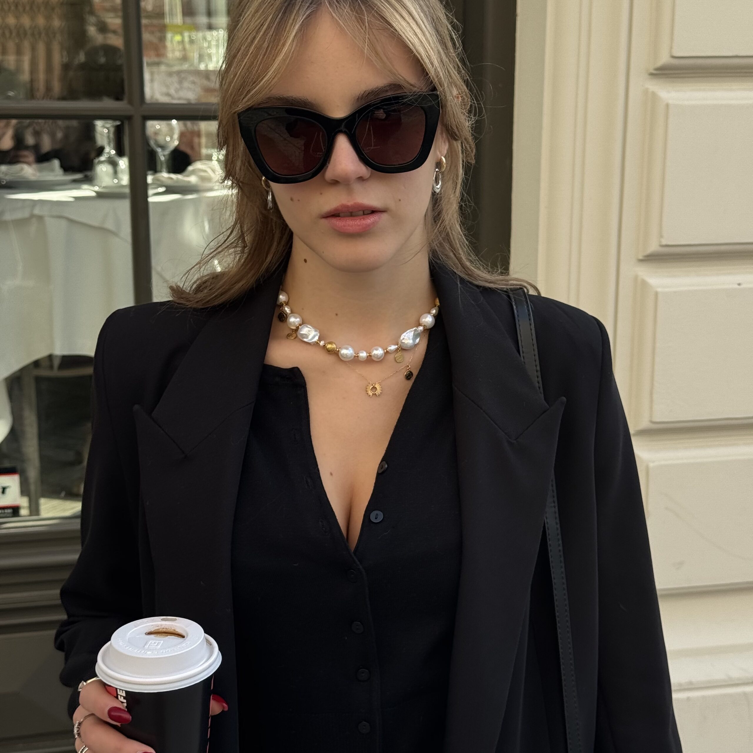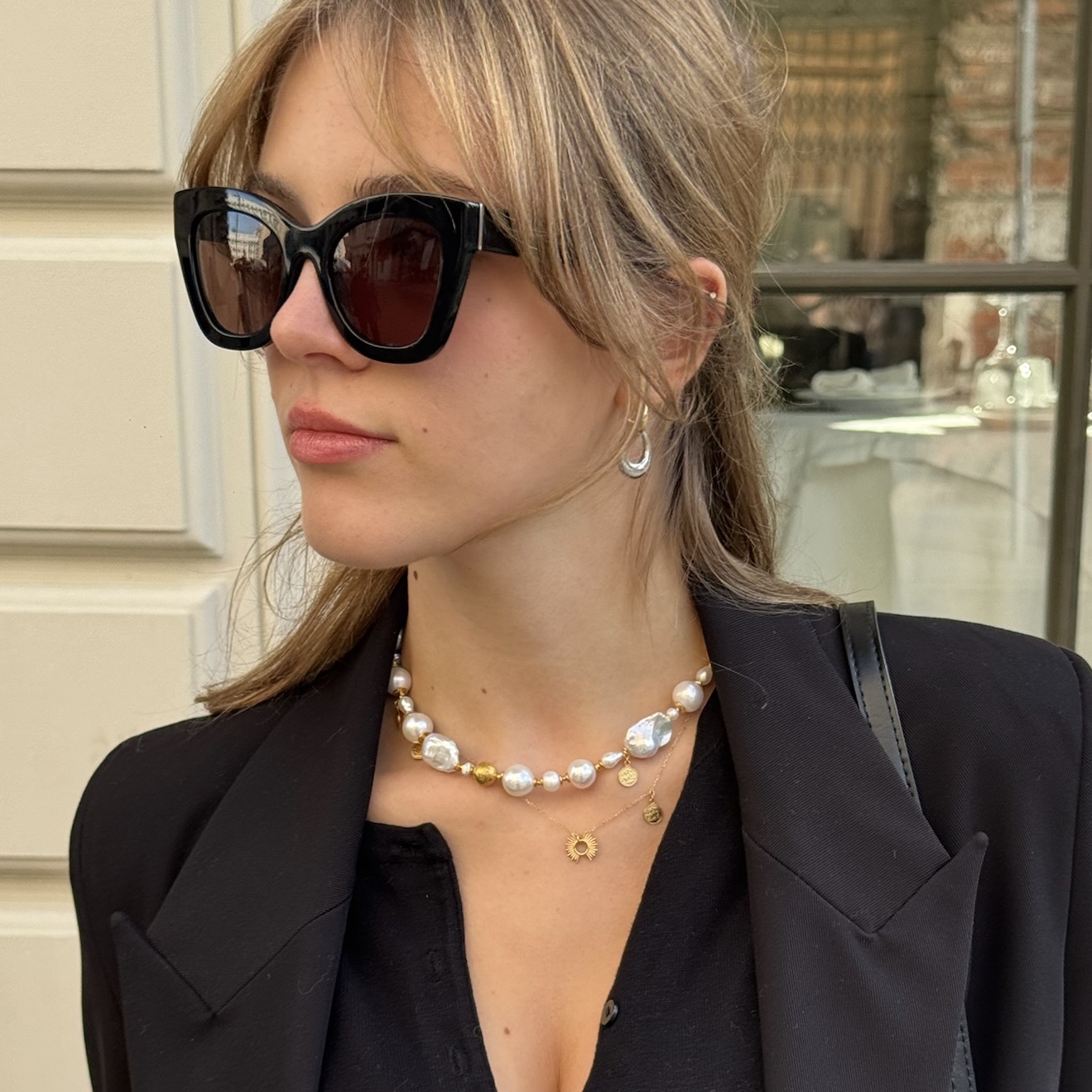 Naszyjnik ten można nosić jako krótki choker, lub jako naszyjnik z zawieszką w postaci podłużnej perły.