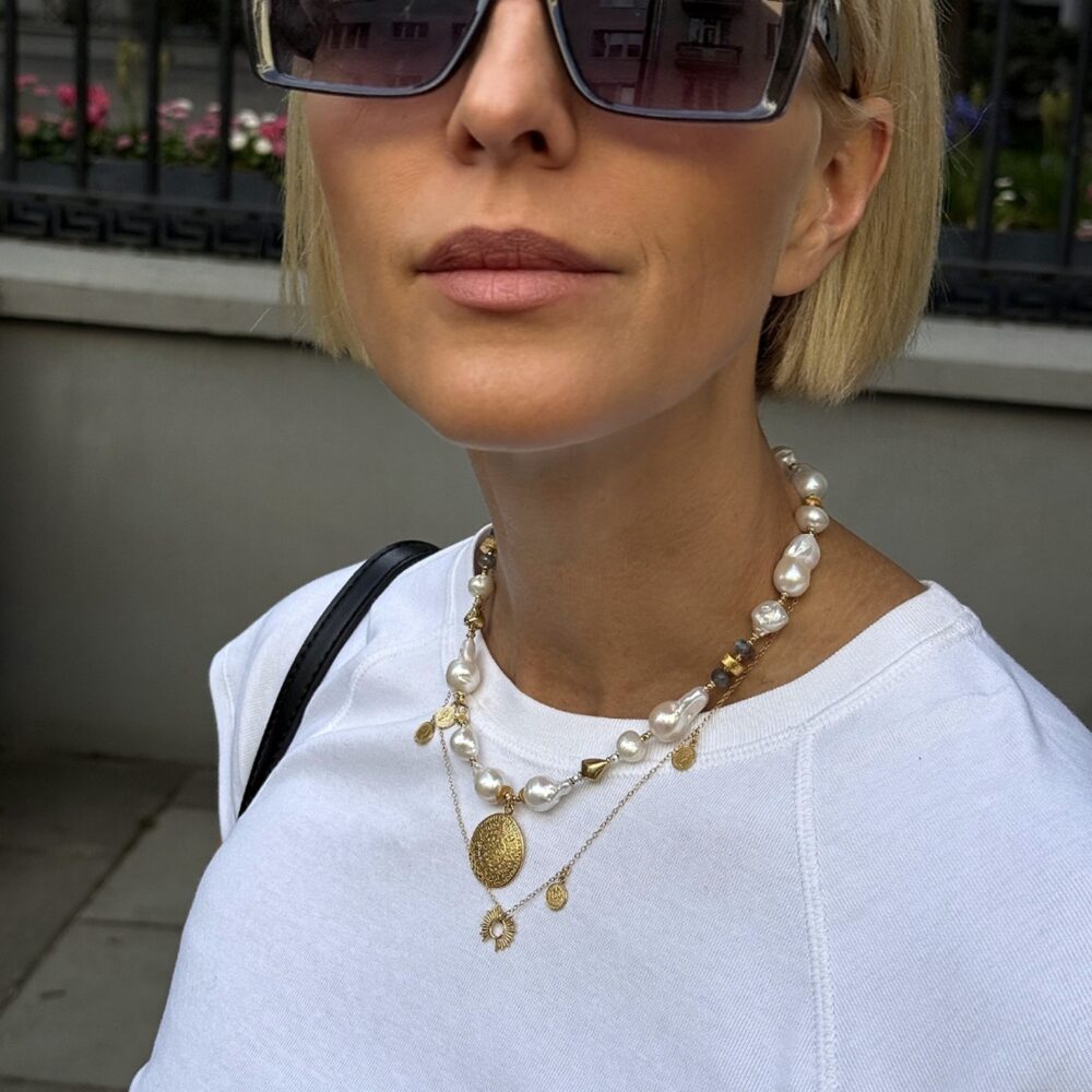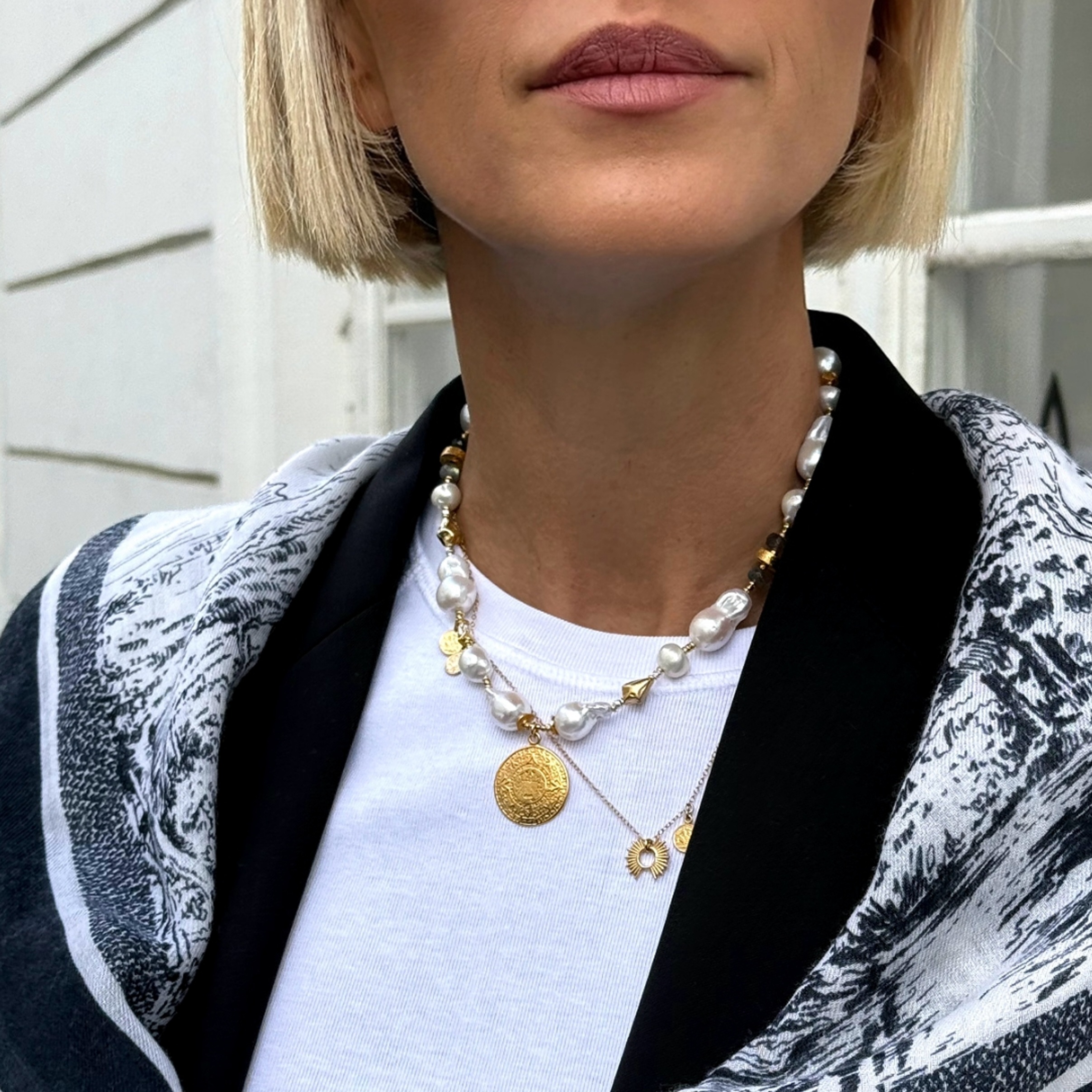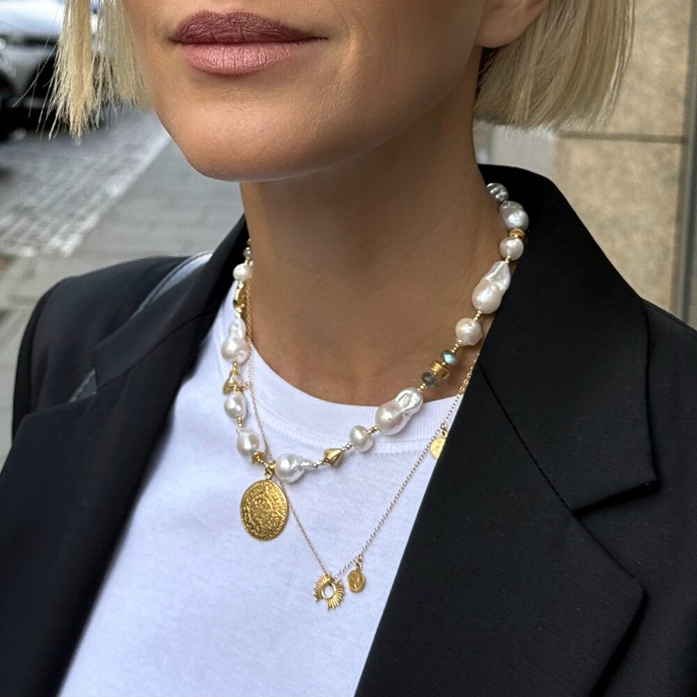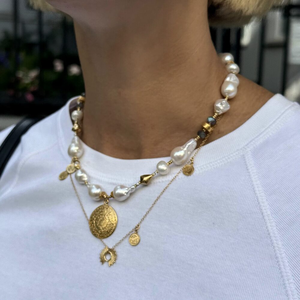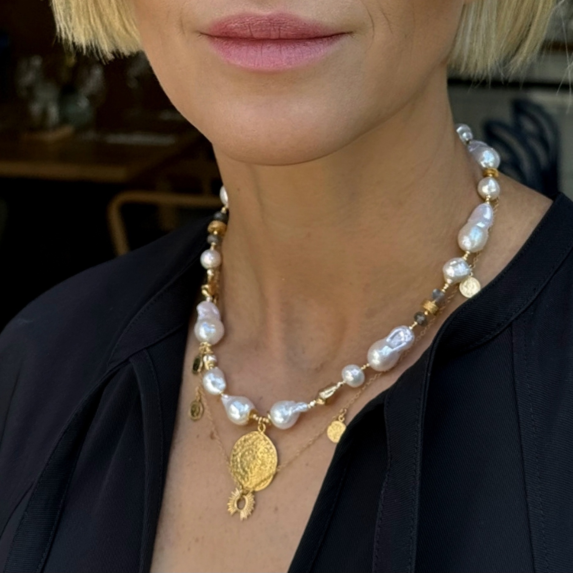 Naszyjnik z nieregularnych pereł z labradorytem I z monetą Azteków