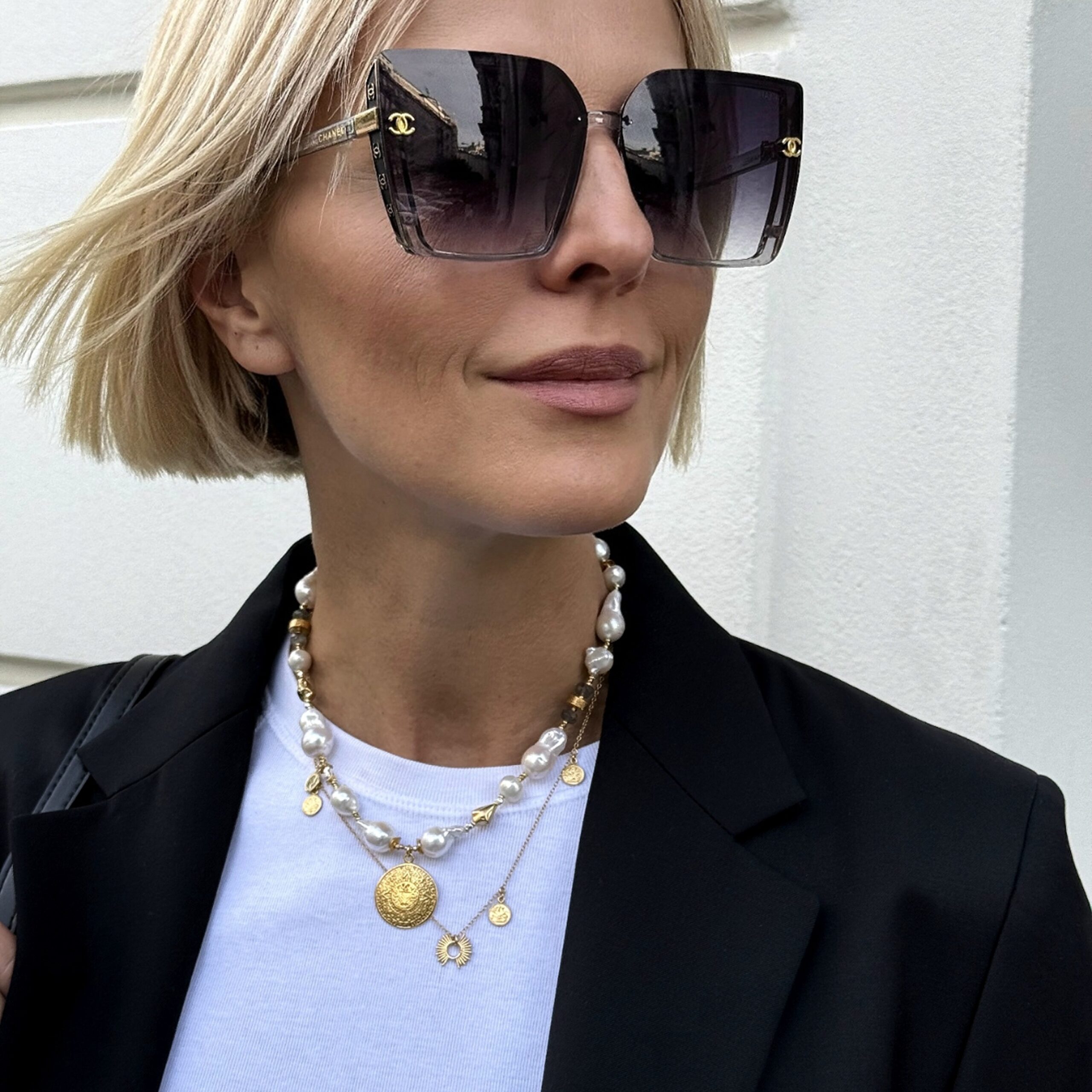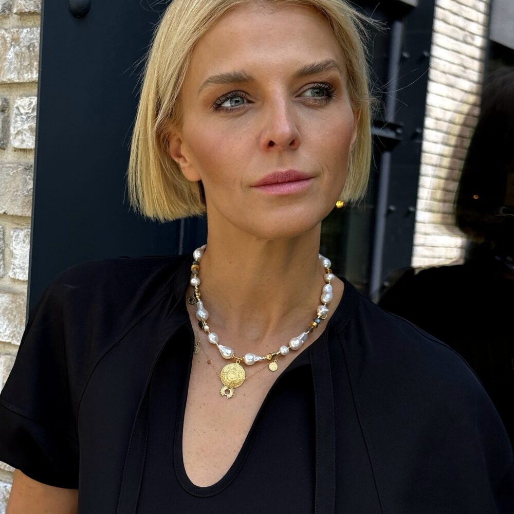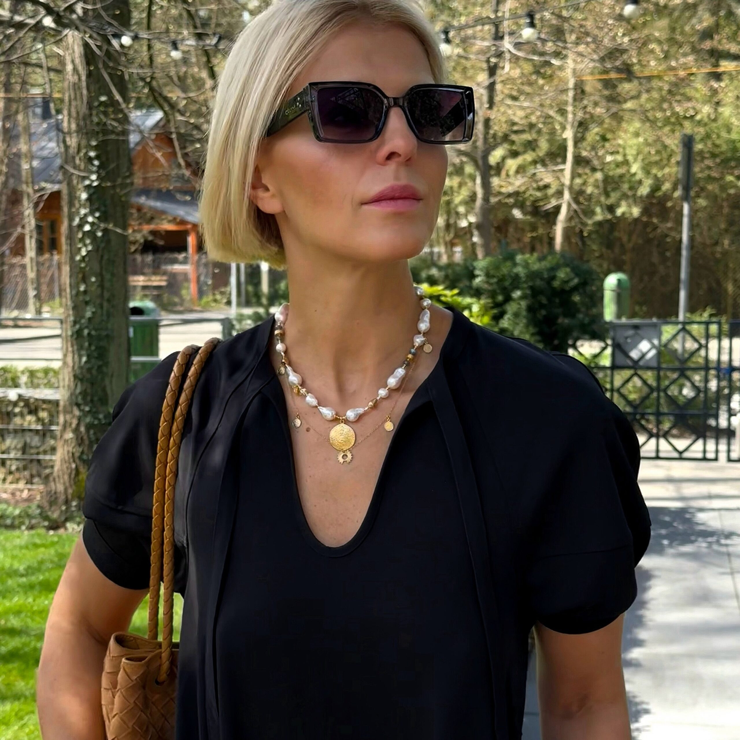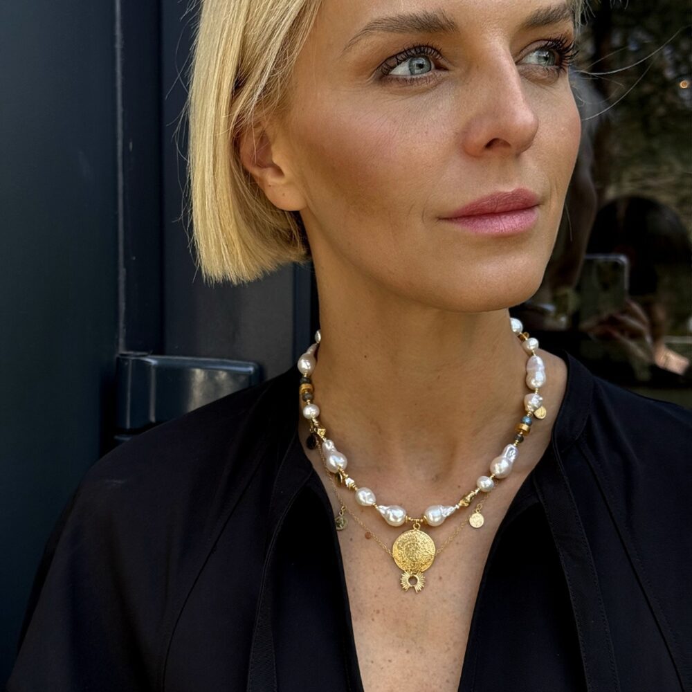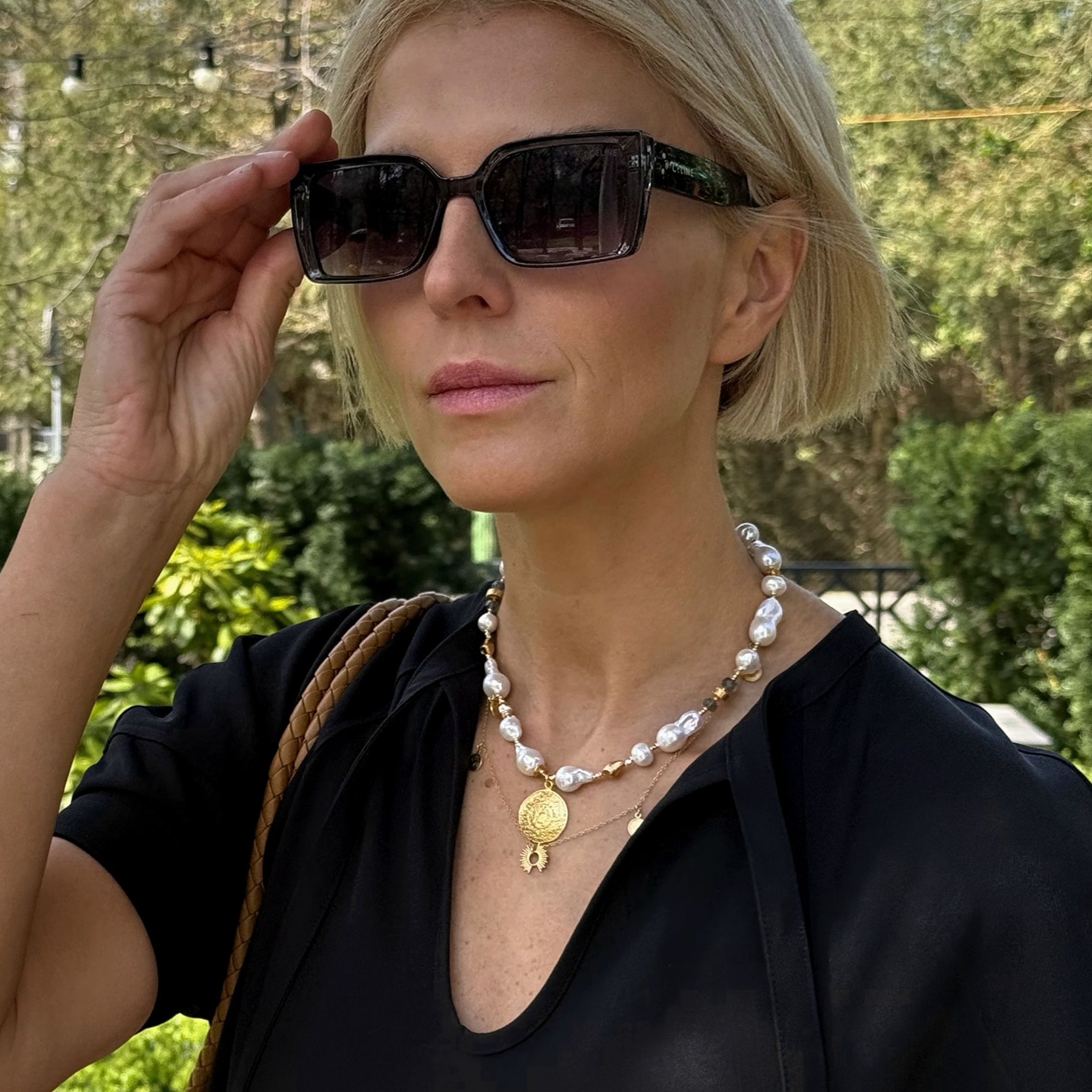 Naszyjnik z nieregularnych pereł z labradorytem I z monetą Azteków