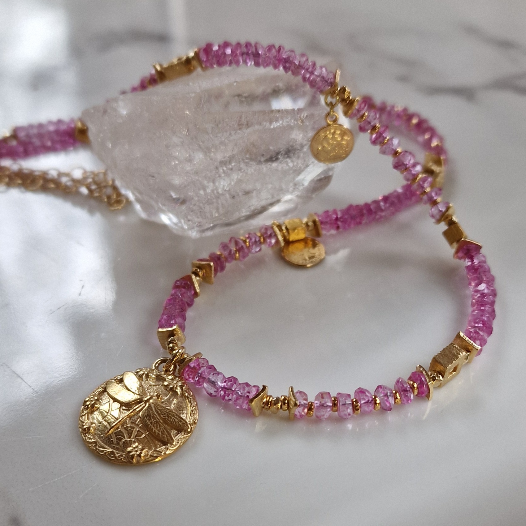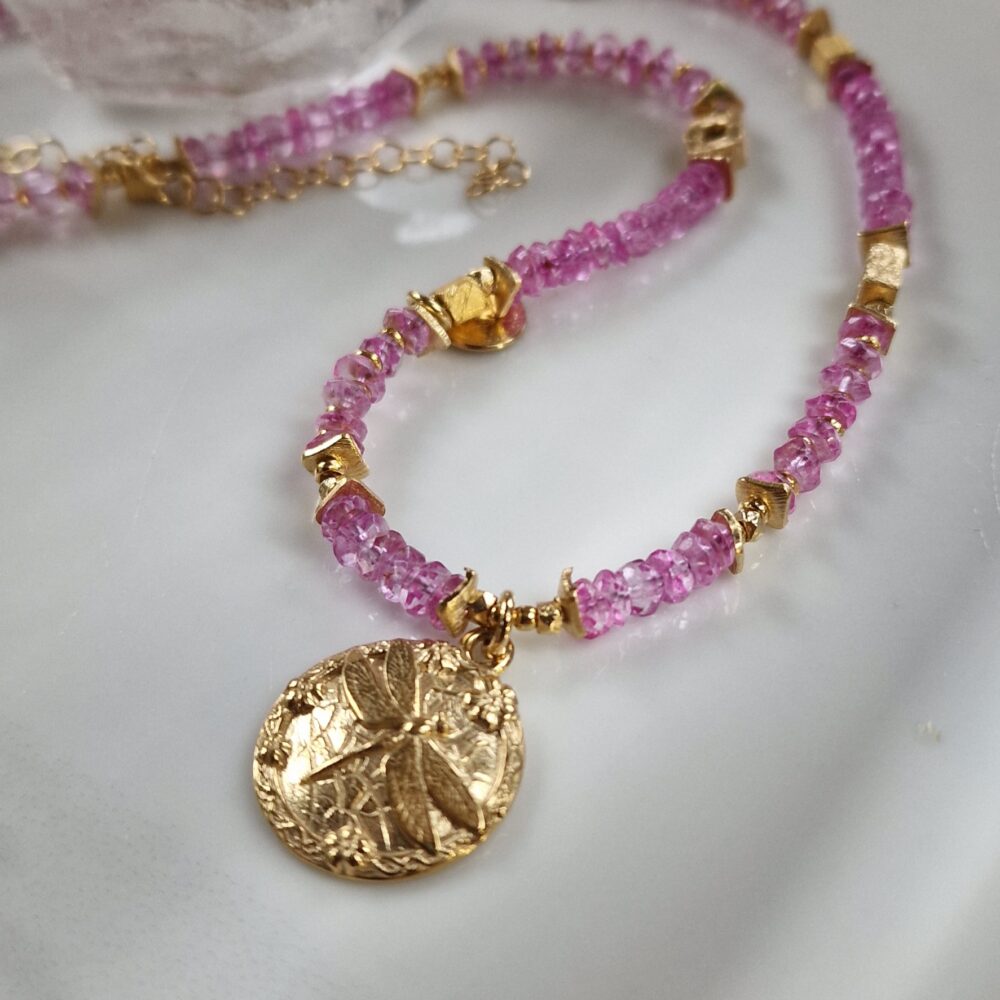 Naszyjnik z doskonałych jakościowo różowych topazów z elementami srebra grubo pozłoconego 24 karatowym złotem, to biżuteria dla kobiet, które cenią sobie styl, klasę unikatowy design.