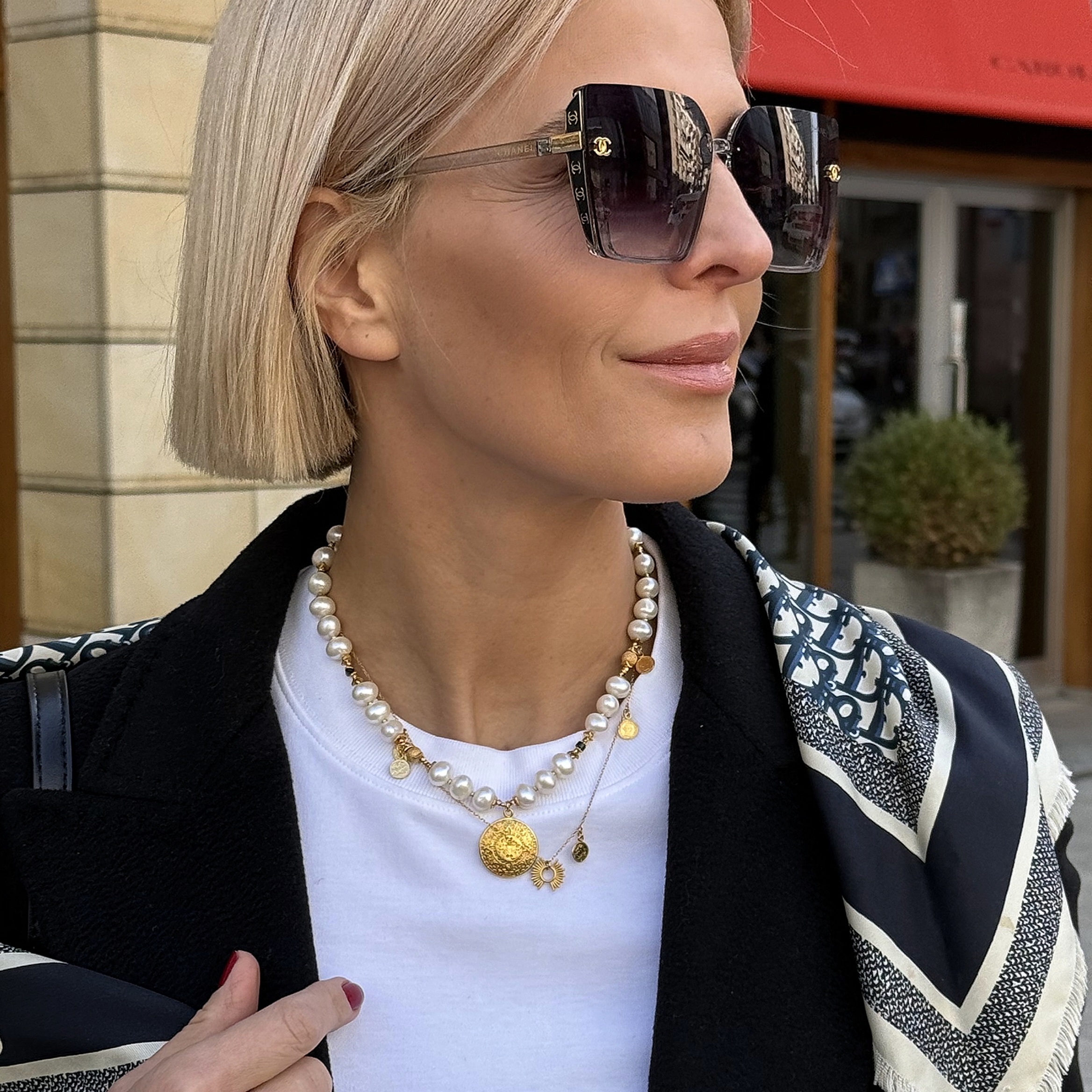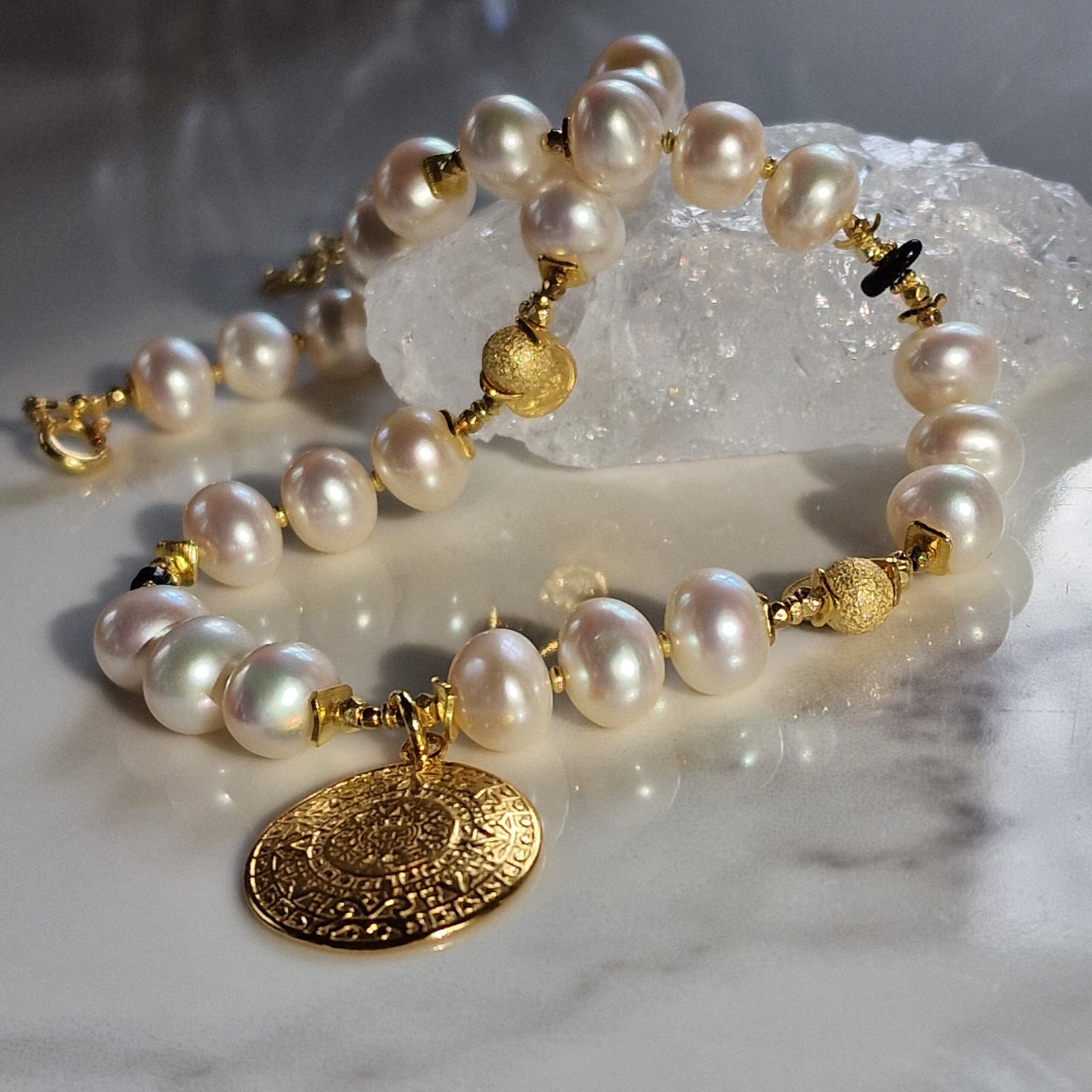 Naszyjnik z pięknych, białych pereł w kształcie oponki, z czarnym turmalinem i z zawieszką w postaci monety Azteków.